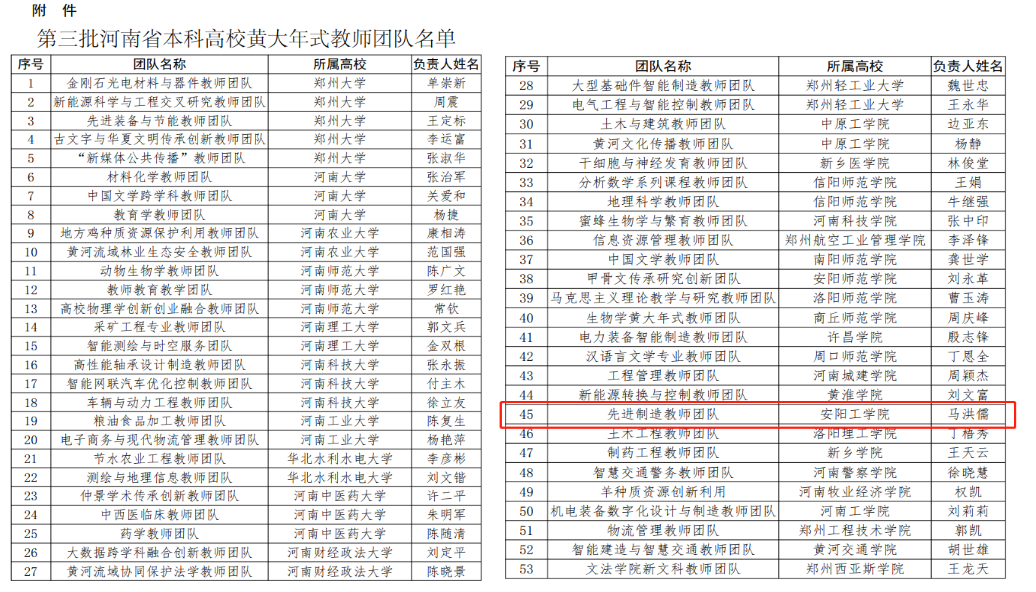 近日,河南省教育厅发布了《河南省教育厅关于公布第三批河南省本科高校黄大年式教师团队的通知》(教办高〔2023231号),公司马洪儒教授负责的“先进制造教师团队”成功入选。